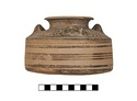 Description:   Intact. Broad flat bottom lifting at edges, straight sides contracting inward toward shoulder, three small vertical handles on shoulder, low splaying neck, flat concave-splaying rim. On base, concentric rings, one at center, three at edge. Body stripes: two, three and two. Shoulder: single wavy line above degenerate ivy leaves(?) between each handle, framed by stripes. Neck and handles painted solid, stripe on reversed rim.