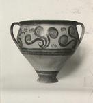 | Description: | Mended from thirty-one pieces. One piece missing below handle; rim chipped. Somewhat restored in plaster. Tall amphoroid krater with torus-disc foot, vertical strap handles from belly to rim, out-turned rim. Rim and foot glazed solid; handles edged with vertical bands, crossed with diagonal bars, framed by thin vertical stripes at ends of 'picture field'; three bands below handles, one above foot. Decoration of three curtailed Argonauts sailing left on each side with conventional formulaic seaweed and trefoil rockwork or rosette motives above and below. Argonauts go over side stripes and touch top stripe. Pale buff clay full of grit and pocks, prominent wheel ridges, fine buff slip, clear light red glaze. Probably Furumark, MP type 6 (III A:1) or 7 (III A:2 early), motive 22, no. 16 (III A:1) 17 no. 18 (II B-III A:1). | |