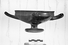 | Description: | Mended from many pieces; three-quarters of the rim, large pieces of the sides, one handle and half of the other, missing. Strengthened with plaster. Reserved: the inside of the handle, the outer edge and the resting surface of the ring foot. Two scratched lines at junction of foot and stem. The top of the stem, beneath, reserved, and decorated with a small circle. Good black glaze. Cf. Agora XII, no. 412. | |