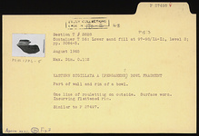 | Description: | Part of wall and rim. Incurving flattened rim. One line of rouletting on outside. Surface worn. Eastern Sigillata A (Pergamene?). Similar to P 27497. | |