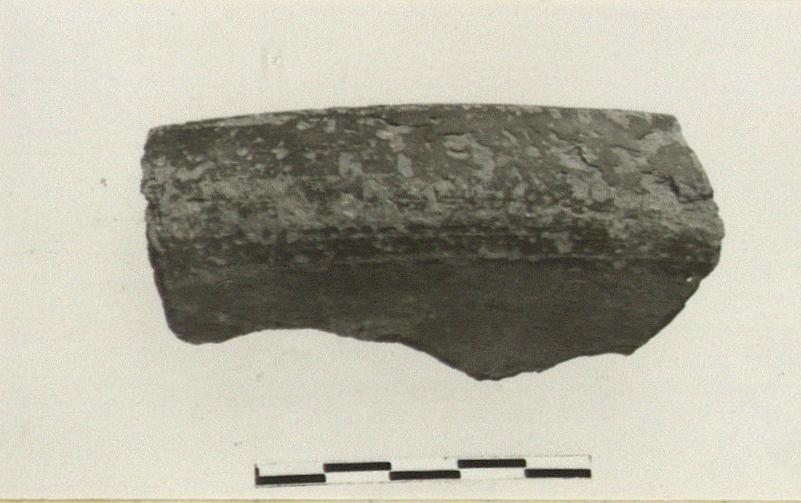 | Description: | From rim of a dish. Vertical curving rim, thickened on inside. Orange ware and slip, fired a deep red-brown on outside of rim. Late Roman C. | |