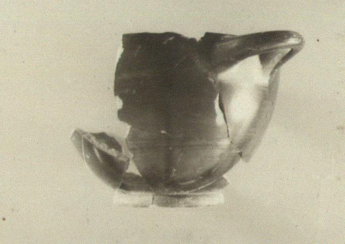 Description:   Mended from many pieces; the base complete, and about a quarter of the rim and side walls with one handle, preserved. The base is small and nearly flat, rising slightly toward the center; the walls of the cup are more spreading and the edge of the rim is sharper than in the ordinary ring-footed type, as P 2372.