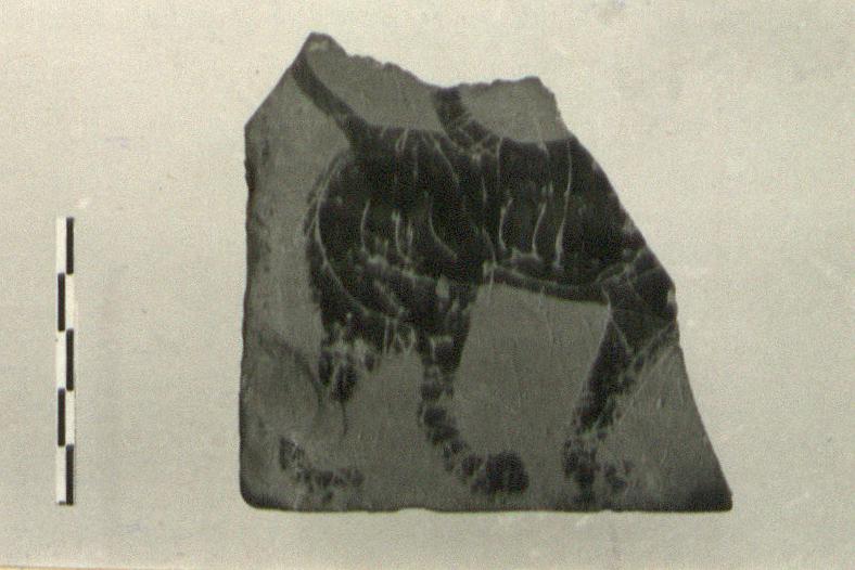 | Description: | Part of handle plate preserved. Lion or similar beast walking right. Only rear half preserved: both back legs, left front leg and raised tail. Incision. | |