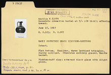 | Description: | Intact. Flat bottom. Shoulder, three latticed triangles, doubly outlines. Otherwise entirely glazed. Handle barred. Pinkish-buff clay; adherent black glaze with slight gloss. | |