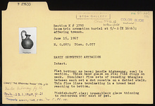 | Description: | Intact. Flat bottom; no base; handle high-swung, oval in section. Thick band glaze on rim; fine rings on neck. Shoulder: five sets of receding triangles between each set a dot rosette on a dotted stalk. Thin fine lines terminating in a broad band reaching to bottom. Pinkish-buff clay; brown-black glaze thinning to red-brown over most of pot. | |