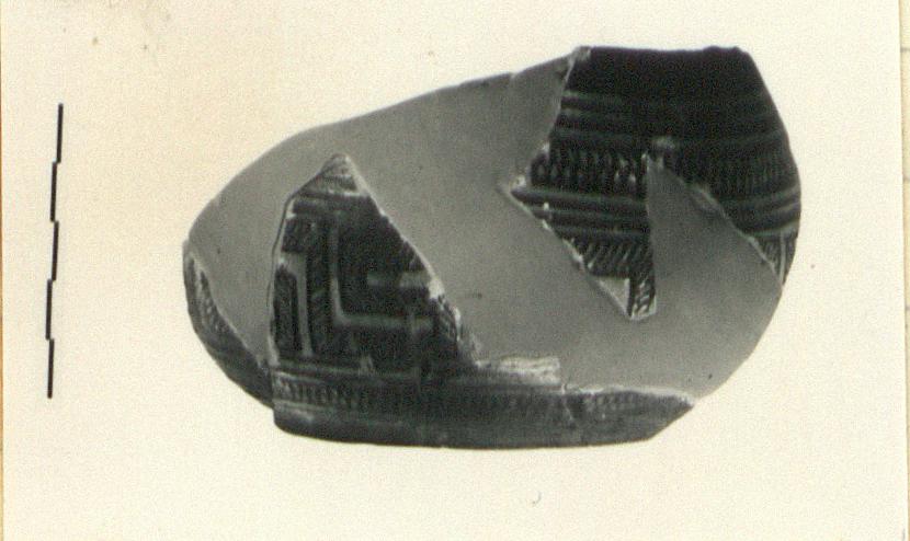 | Description: | Two non-joining fragments put together in plaster, preserve about one-fourth of body and profile probably almost to base. Half of one tie-hole. On flange to left of it, a reference mark: Χ. Strongly rounded shoulder; rather thick flange only slightly countersunk. On body, fine zigzag, hatched maeander, zigzag; then solid glaze. Hard clay; firm lustrous glaze, variously discolored. | |