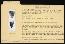 | Description: | One large fragment preserves about one-third of the body and two-thirds of the profile. The point, non-joining, appears to belong. Completely restored in plaster. One tie-hole with reference mark. Zones on body: zigzag, zigzag, hatched maeander, dogtooth, zigzag, rings, then solid glaze to point. Black glaze, much peeled. Variously smoke-discolored. | |