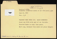| Description: | About one-fifth with part of one tie-hole. Reserved bands on edge; then glaze. Hard clay, darkened from smoke and glaze damaged. | |
