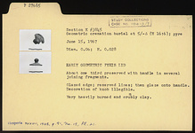| Description: | About one-third preserved with handle in several joining fragments. Glazed edge; reserved lines; then glaze onto handle. Decoration of knob illegible. Very heavily burned and crumbly clay. | |