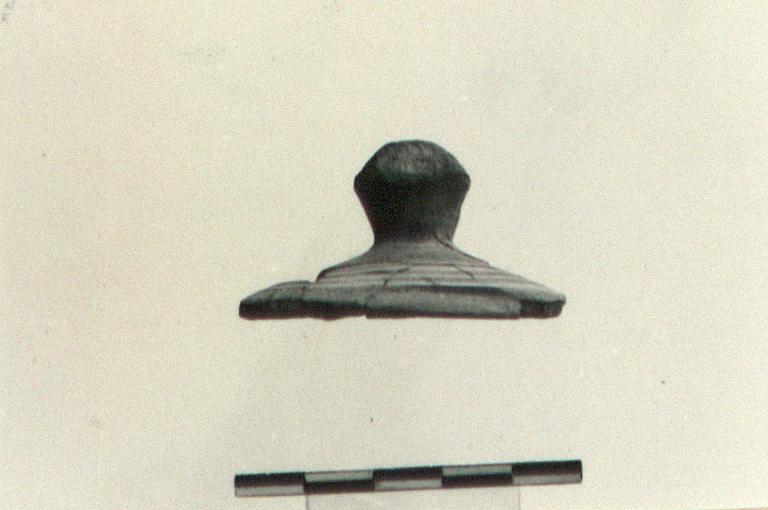 | Description: | About one-third preserved with handle in several joining fragments. Glazed edge; reserved lines; then glaze onto handle. Decoration of knob illegible. Very heavily burned and crumbly clay. | |