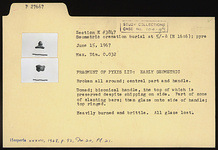 | Description: | Broken all around; central part and handle. Domed; biconical handle, the top of which is preserved depite chipping on side. Part of zone of slanting bars; then glaze onto side of handle; then glaze onto side of handle; top ringed. Heavily burned and brittle. All glaze lost. | |