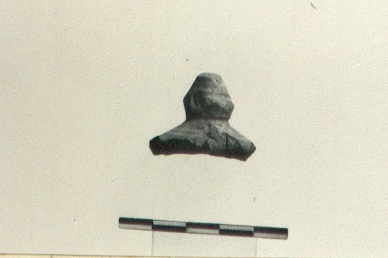 | Description: | Broken all around; central part and handle. Domed; biconical handle, the top of which is preserved depite chipping on side. Part of zone of slanting bars; then glaze onto side of handle; then glaze onto side of handle; top ringed. Heavily burned and brittle. All glaze lost. | |
