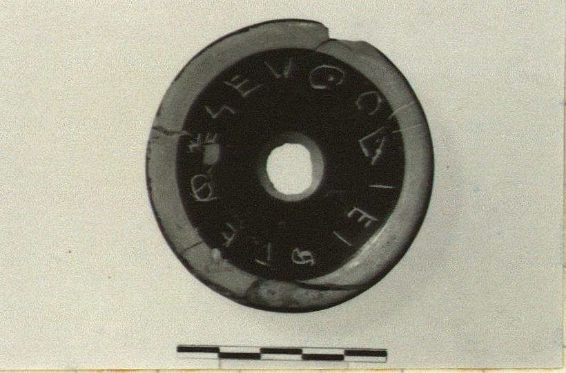 Description:   A complete kylix foot in five joining fragments. Black glazed with a reserved line ca. 0.012m. from the edge. Inscribed on the bottom, letters facing in.