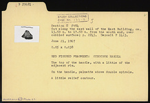 | Description: | The top of the handle, with a little of the adjacent rim. On the handle, palmette above double spirals. A little relief contour. | |