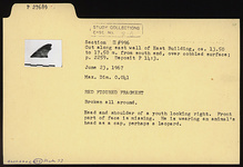 Description:   Broken all around. Head and shoulder of a youth looking right. Front part of face is missing. He is wearing an animal's head as a cap, perhaps a leopard.
