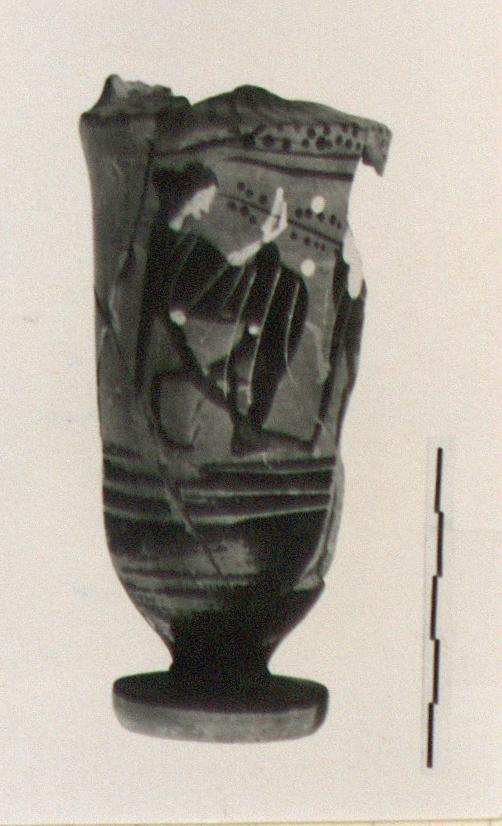 | Description: | Neck, handle and part of body missing. Seven joining fragments. Seated woman facing a half preserved object, perhaps the back of the chair of another seated figure. Hands, face, feet and other details painted white. Drapery marked with sloppy incision. Rays on shoulder of lekythos; lower body black glazed with uneven reserved lines. | |