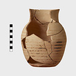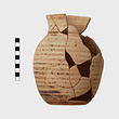 Description:   Handle, one-third of rim and chips from body missing. Mended from many fragments. Round mouth. Body banded. Wavy lines on neck. Panel on shoulder with stacked M ornament.