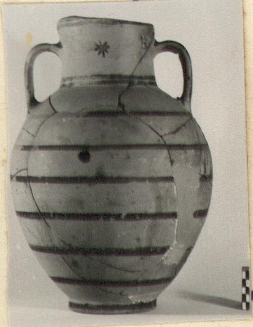| Description: | Rim and fragments from wall missing. Partially restored in plaster. Mended from numerous fragments. Broad bands on body, glazed foot. Double bands at top and bottom of neck. Two 8-point stars on neck. Double crossed bands on strap handle. Small round hole in wall as if intentionally bored. Thin brown glaze, reasonably well preserved. | |