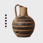 | Description: | Mouth, chips and inside of foot missing. Mended from many fragments. Neck with maeander and zigzag. Body glazed with groups of reserved bands. Handle with herringbone laddered above and below. Peeling dull blue-black glaze. Cf. Hesperia 68 (1999), p. 262, n. 109 | |
