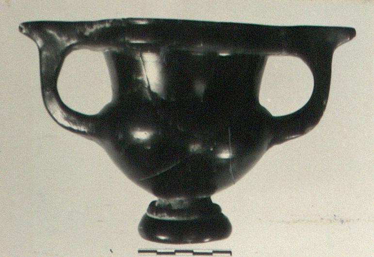 Description:   Small pieces of body and rim restored. Mended from numerous fragments. Similar in shape to P 27966 but somewhat less squat. Foot is smaller and higher. Scraped line at junction of mouldings on foot, and groove on resting surface scraped.