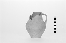 | Description: | Intact except for part of rim and neck. Joining fragment at rim and neck. Low ring foot; curving, slender body; tapering neck. Offset rounded rim; strap handle attached below rim . Orange-red clay, somewhat gritty. | |