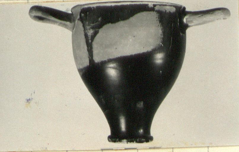| Description: | Missing are one handle with its rim section and part of the other handle. Restored in plaster. Ring foot, bulging shoulder, slightly out-turned lip. Completely glazed. Pinkish-buff clay; glaze dull black to brown, mostly worn off upper half of exterior. Cf. P 27969. | |