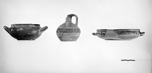 Description:   Most of mouth missing and much of wall. Partly restored in plaster. Low disk base; flat bottom.