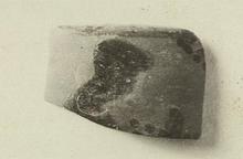 | Description: | From the top of the wall with the start of the shoulder. A brown band at the top, beneath which the head of a figure (woman?), right. Vines in field. Uncertain pattern on shoulder. Orange wash. | |