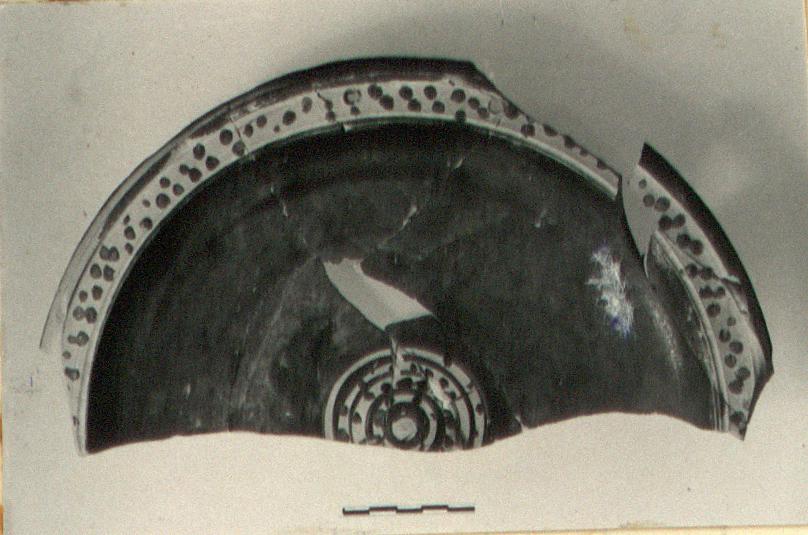 | Description: | Mended from twelve fragments; preserved is about one-half of plate. Low base ring, shallow bowl. Flaring down-turned lip with a low ridge rising from its inner edge. Two holes in rim. Top of rim reserved with large dots in dilute glaze. On floor in reserved area, alternating concentric bands and ring of dots in black dilute glaze. On foot resting surface reserved. At center of underside, in reserved area, rings in dilute paint. Exterior careless dilute wash. Dull black glaze. Pink clay. | |