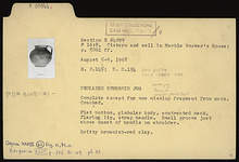 | Description: | Complete except for one missing fragment from neck. Cracked. Flat bottom, globular body, contracted neck, flaring lip, strap handle. Small groove just above onset of handle on shoulder. Gritty brownish-red clay. | |