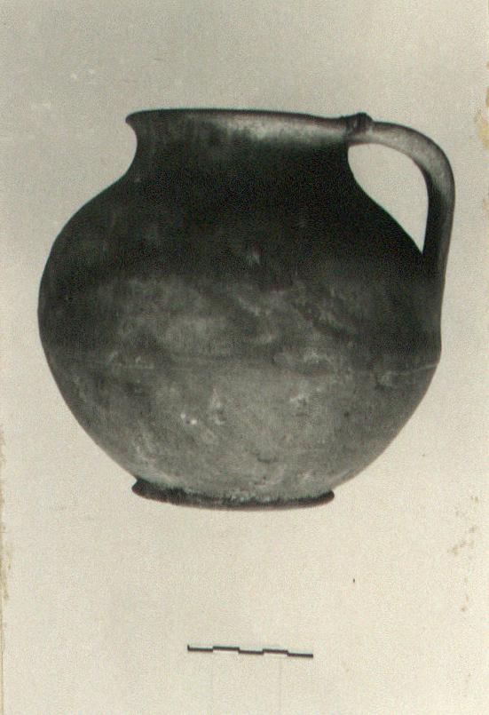 | Description: | Complete except for one missing fragment from neck. Cracked. Flat bottom, globular body, contracted neck, flaring lip, strap handle. Small groove just above onset of handle on shoulder. Gritty brownish-red clay. | |