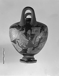 | Description: | Mended from many pieces; wall fragments and handles restored. A) On the shoulder, tongues above ovules. Two women, one moving left, the other right. They carry chests with long taeniae and both look back toward a small Eros who flies between them, right. B) On the shoulder, tongues. Two Nikai, flying left and right. No relief contour. Added white for face and arms of Eros; an added color, now vanished, for his wings, and added clay for the wing-ribs. For the shape at this stage of development, cf. the example by the Marsyas painter: ARV, p. 1475, no. 1, and cf. Schefold (1934), pl. 15, no. 277 with the Marsyas painter piece there, pls. 33, 34. (LT) | |