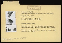 | Description: | Cradle-shaped bowl. Preserved are two non-joining end pieces of rectangular bowl, similar in type to P 28061. Traces of very poor black glaze or wash. Soft pinkish-buff clay. | |