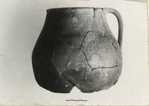 | Description: | Mended from many pieces. Bottom missing, also nearly one-half of rim and parts of side wall. Partially restored in plaster. Bulbous body, broad round mouth with angular rim. Single strap handle. Parallel vertical striations in dark color begin at rim, ending at level of lower handle attachment. Coarse gritty clay, red to brown. Bottom blackened by fire. Cf. Agora XXXIII, no. 560. | |