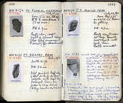 | Description: | Preserved are toe and part of lower body. Flaring cuffed toe with shallow depression underneath; interior rough, goes below upper edge of toe. Red clay, buff surface, micaceous, especially on surface. Cf. P 27531. | |