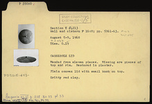 Description:   Mended from eleven pieces. Missing are pieces of top and rim. Restored in plaster. Plain convex lid with small knob on top.