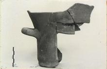 | Description: | Mended from many fragments. Much of bowl missing, including all of rim, as well as two-thirds of stand perimeter. Partially restored in plaster. Fire bowl originally fairly deep and pierced by a central and several lateral holes. Side of wall also pierced. Loop handles. Stand is a low, hollow column with a large air-hole. Side wall slightly curved inward at foot. Narrow resting surface on perimeter of foot. Gritty reddish clay. Slight traces of burning. | |