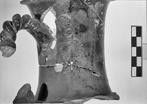 Description:   Mended from numerous pieces. Parts of shoulder, most of neck and mouth, and half of the handle preserved. Shoulder decorated with alternating panels of checkerboards and diminishing rectangles done in clay and added white. Shoulder is offset from neck by a line of miltos. Neck decorated with vine and floral patterns in added clay, now largely lost. Twisted handle. Out-turned flat lip.
