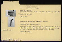 | Description: | Fragment from rim and wall. Overhanging rim, flat on top; a plain moulding 0.02m. below it on exterior. On all interior surfaces to top of rim, vertical and horizontal scored lines. Pink-buff clay. Coarseware; "Umbrella Stand". | |