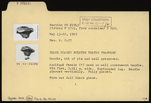 | Description: | Handle, bit of rim and wall preserved. Applique female(?) mask on wall underneath handle. Rim flat. Horizontal lug. Handle pierced vertically. Fully glazed. Firm but dull black glaze. | |