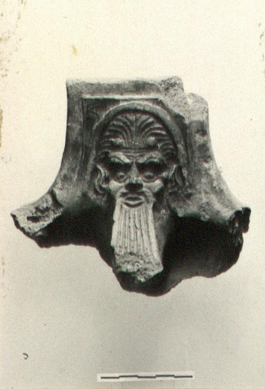 | Description: | Lug in form of Satyr's head. Long beard with six lengthwise grooves; pointed ears. To left side of head above, a K in relief, and to right, a horizontal stroke of a second letter. Red cooking fabric with flecks of gold mica. | |