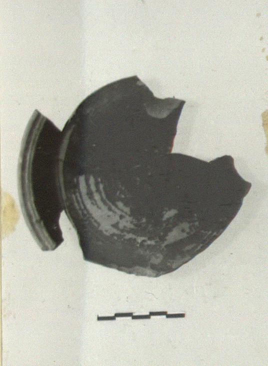 | Description: | Most of floor and foot and small part of rim preserved in three fragments. Ring foot; large flat floor; narrow rilled rim. Fully glazed except for resting surface. Thin dull glaze, red to black. | |