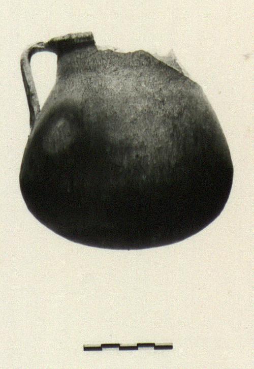 | Description: | Half of rim and one handle missing, otherwise intact. Round bottom; vertical neck with slightly flaring lip; vertical strap handle. Coarse gritty ash-gray clay with brown core. Fired red on bottom. Cf. Hesperia 3 (1934), p. 390, no. D 71. | |