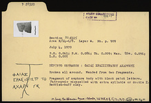 | Description: | Broken all around. Mended from two fragments. Fragment of amphora body with black paint letters. Patronymic misspelled with extra syllable or double Σ: <graphic> Reddish-buff clay. | |
