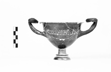 Description:   Mended from several pieces. Parts of handles missing. Partially restored in plaster. Moulded foot, short stem. Interior of foot concave. Entire foot and stem red. Deep bowl body with out-turned rim. High swung loop handles. Between handles is painted a garland-like decoration, in brown paint with traces of white, consisting of a horizontal line, slightly sagging, a row of dots above it, below it pendent lozenges on one side, hanging ribbons and dots on the other side. Interior glazed black, red at bottom.