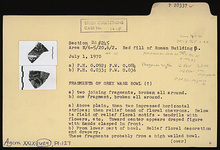 | Description: | a) Two joining fragments, broken all around. Above plain, then two impressed horizontal stripes, then relief band of floral chevrons. Below is field of relief floral motifs - tendrils with flowers, etc. Toward center appears draped figure with hands clasped in front. b) One fragment, broken all around. From lower part of bowl. Relief floral decoration and drapery. These fragments probably from a high-walled bowl. Hard flaking black glaze over soft gray clay. | |