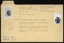 | Description: | Considerable portions of body missing; restored in plaster. Round body, no base; roundish mouth. Backwards sloping handle. Light brown clay, often discolored at surface. Unglazed. Handmade. | |