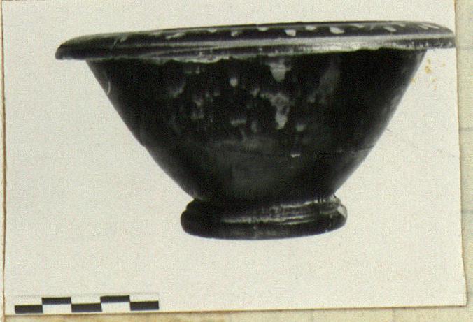 | Description: | Complete except for chips; mended from many pieces. Moulded ring base; convex walls; slightly downturned rim; upper surface of rim offset by scraped grooves with added miltos. Between grooves: vine pattern done in clay and added white. On floor: scraped circle with added miltos; within circle, a large rosette done with alternating leaves of added clay and white. Orange clay. Metallic black glaze. Added white paint and tan slip. | |