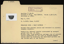 | Description: | Mended from several pieces and restored in plaster; largely complete. Medallion: debased rosette surrounded by scraped groove and row of dots. Middle zone: from medallion springs a row of pointed leaves surmounted by two rows of lozenge-shaped leaves, made by reversing the half-leaf pattern for the bottom half of the leaves. Rim pattern: a row of ribbed leaves surmounted by a row of double spirals, this in turn topped by palmettes over junction of every second spiral. Orange clay. Metallic black glaze. | |