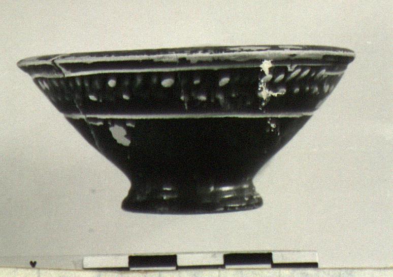 | Description: | Mended from two pieces; over half preserved. Flaring, moulded ring foot; flaring side walls; flat, very slightly downturned rim. Two scraped grooves, filled with miltos, on outside just below rim. Between grooves: herringbone pattern done in added clay. Light orange clay. Tan slip. Black glaze, peeled off in places. Originally idendified as a cup. | |